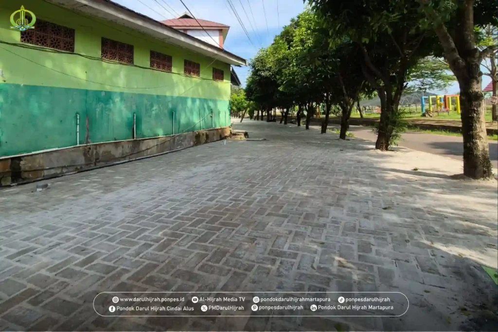 Sebagai langkah awal pengembangan fasilitas, pemasangan paving blok telah dilakukan di area belakang bangunan SMA dan MTs Pondok Darul Hijrah. Tidak hanya memperindah tampilan lingkungan, paving ini juga menjadi solusi nyata terhadap debu yang kerap beterbangan saat santri berlalu-lalang.
